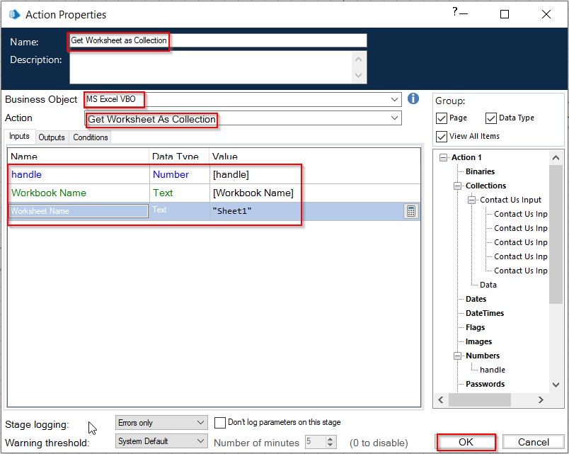 - Action 3 stage, click 'Inputs' tab, give expression [handle] and excel path, click 'Outputs' tab, click 'Store In' Icon, it automatically takes 'Workbook Name' data item.